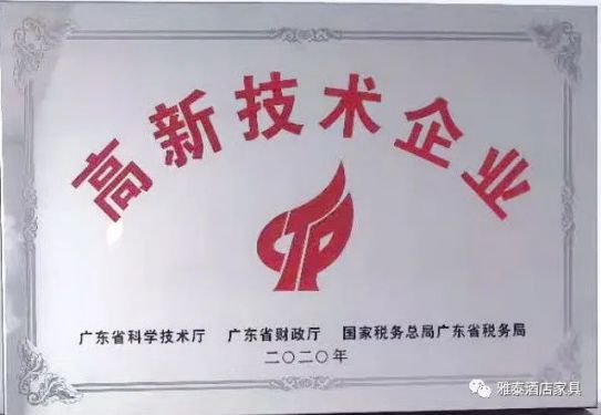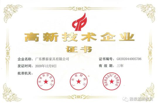 “高新技術企業(yè)”認定是政府為支持企業(yè)發(fā)展而設立的一項權威認定類資質(zhì),是我國科技創(chuàng)新企業(yè)的一項重要榮譽,對公司在核心自主知識產(chǎn)權、科技成果轉(zhuǎn)化能力、研究開發(fā)的組織管理水平、成長性指標和人才結構的綜合評估和認定,也是對企業(yè)科研實力的高度肯定。此次高新技術企業(yè)認定,意味著雅泰酒店家具在技術實力、持續(xù)創(chuàng)新能力、核心自主知識產(chǎn)權和企業(yè)經(jīng)營管理等方面取得長足進步,獲得了業(yè)界和國家權威部門的充分認可,將進一步推動雅泰家具自主創(chuàng)新、自主研發(fā)的進程,同時也是雅泰家具發(fā)展史上的又一個里程碑!