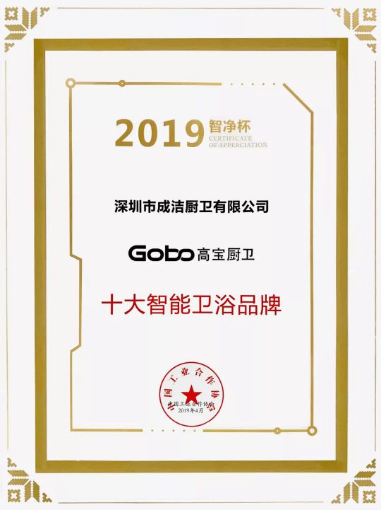 2019年4月23日,在“智能馬桶可靠性成果推介會暨第三屆中國智能衛浴論壇”上,Gobo高寶廚衛憑借多年來深厚的品牌影響力以及銳意創新的企業實力,一舉斬獲智凈杯 “十大智能衛浴品牌”。