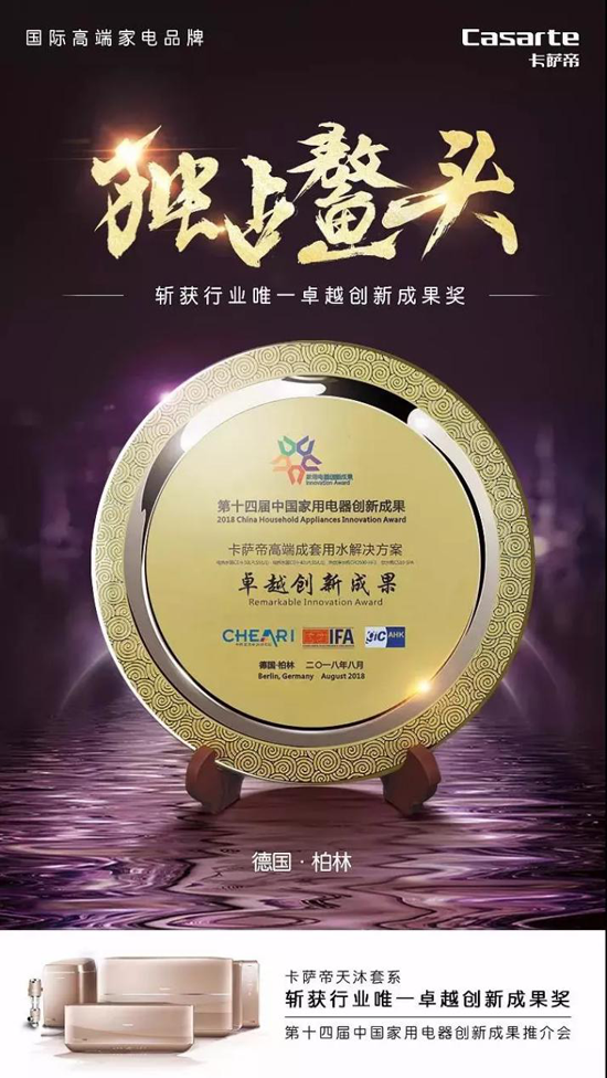 在此前中國家用電器研究院主辦的“第十四屆中國家用電器創新成果推介”IFA展上,卡薩帝熱水器天沐套系還獲得年度卓越創新成果大獎肯定,也變為了行業唯一獲此殊榮的套系產品。