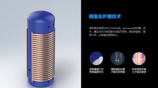 LEASY領致空氣能一體機采用德國全護搪內膽技術,在搪瓷專用鋼板表面采用德國滾搪工藝技術,把美國福祿搪瓷粉進行配比,經過860度高溫鍍搪,形成瓷釉保護層,具有不結垢,壽命長,水質清潔健康等特點,設計壽命超過15年。達到澳大利亞WARTER MARK、北美ETL、英國WRAS、歐盟CE等國際標準。