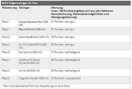 SONAX輪轂清潔劑不負眾望成為該權威測試的優勝者,并被德國機動車監督協會推薦為輪轂清潔首選產品。其它幾款清潔劑都或多或少的存在各種扣分點。尤其在被列為“不被推薦”的TugaAluminium-Teufel,不僅清潔性能劣質,酸性超強,還在存在嚴重腐蝕性的成分,無一能像SONAX輪轂清潔劑做到各方面完美無暇!