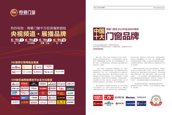 翻閱最新一期的《環球人物》,首先映入眼簾的是一個名為“尊霸門窗”的中國品牌;再往下閱讀,報道中“央視展播品牌”、“中國十大門窗品牌”等字眼更勾起了讀者對尊霸門窗的了解欲望,紛紛主動加入到尊霸門窗的熱議大軍中,一探品牌究竟。