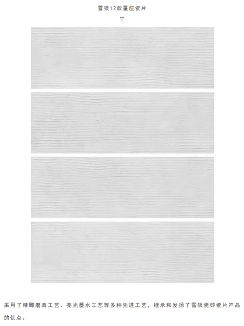 當然,雪狼瓷磚的好產品遠不止于此。陶博會開幕前和開幕后,其新品12星座瓷片被陶瓷資訊、華夏陶瓷網等媒體鼎力推薦,“四大文明”仿古磚也適時上市,被譽為非常有文化品位的產品。