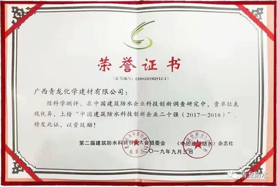 9月,第二屆建筑防水科技創新大會上,青龍司榮獲“中國建筑防水科技創新企業二十強”,成為繼獲得首屆建筑防水科技創新大會“科技先鋒企業”和“科技先鋒人物”之后,青龍再獲“科技”類殊榮,彰顯了青龍公司強勁的科技創新實力和在行業的技術地位。