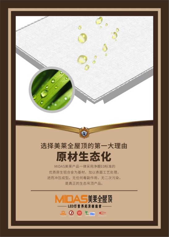 MIDAS美萊產品一律采用凈醛E0標準的優質原生鋁合金為基材,加以表面工藝處理,進而沖壓成型。無任何毒副作用,無二次污染,是真正的生態集成吊頂產品。從嚴謹有序的研發生產,到選用最環保的原材,每一個細節,每一個設計,都承載著無數美萊人的堅守和執著,這是對每一個消費者的保障,也是對每一個家庭的保護。