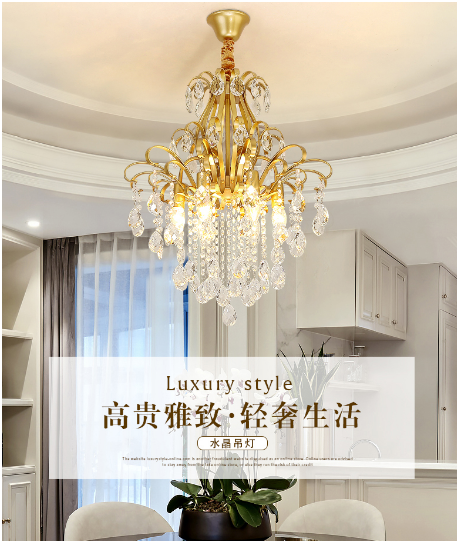 你看,屋頂的那盞輕奢風燈飾,多像戴著水晶耳環的金發少女,她從數百年前的歐洲宮廷而來,搭載著星星的小船,穿過歷史的長河,回歸數百年后的雅致今天。